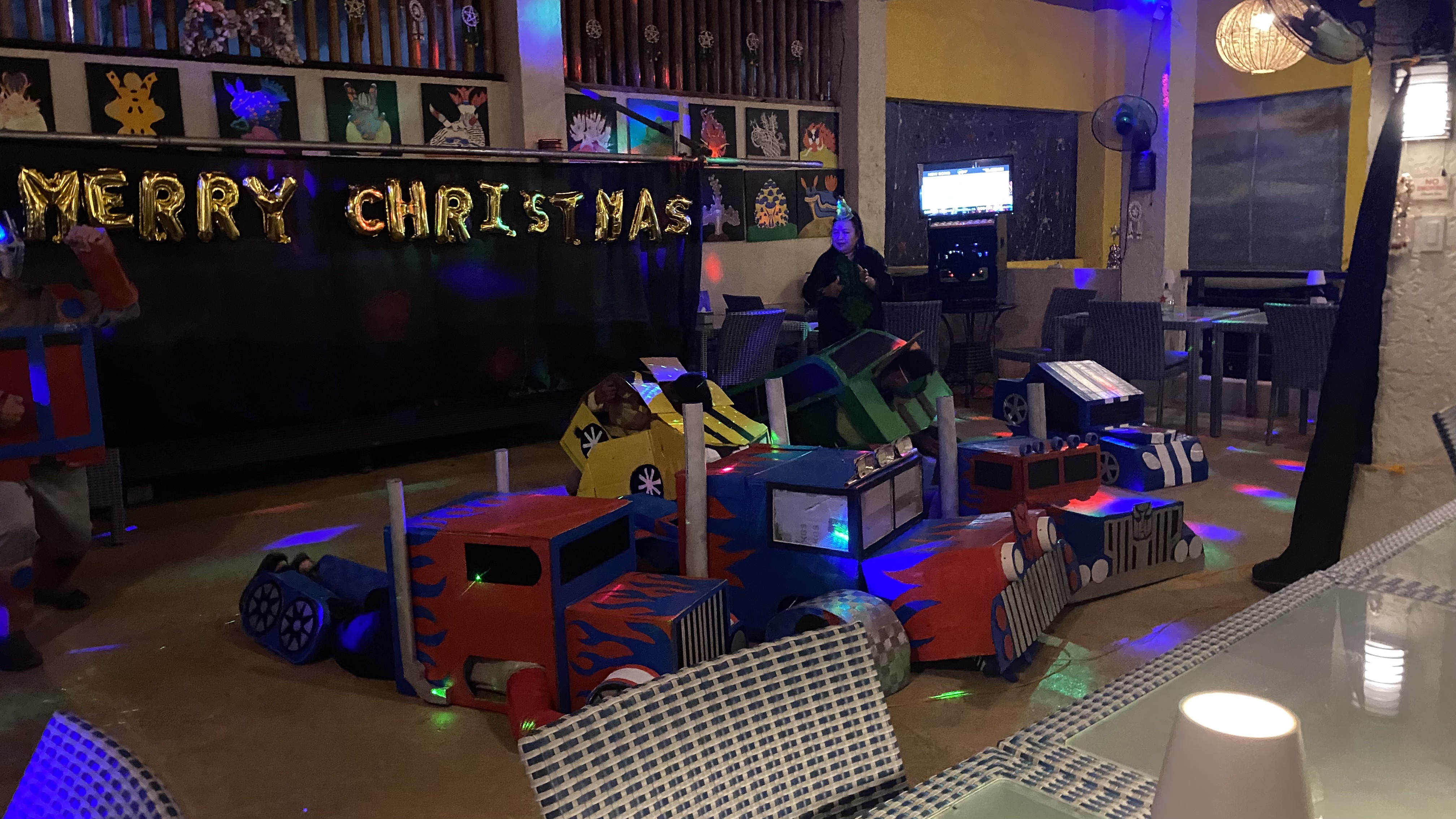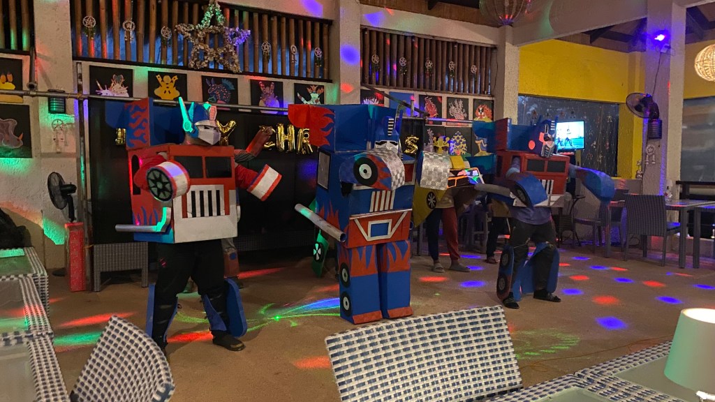 Vanmorgen bericht van een mededuiker: als je snel bent kun je nog een geit zien slachten. Ik was gelukkig niet snel. Even later lag het dier met gestrekte pootjes op tafel, klaar om uit zijn jas te worden geholpen te worden. Om dat goed te kunnen doen, werd er lucht via de strot ingeblazen. Bij terugkomst van de twee ochtendduiken lag het dier inmiddels in keurige kleine stukje verdeeld op een hoop. De kop apart, de lever in stukjes gesneden en nog wat restanten voor de honden en de kraaien op de keien van het strand. Vandaag groot feest, die geit was voor bij de borrel. Al het personeel, ook de parttimers, was aanwezig, eerst een wedstrijd. Elke beroepsgroep, meestal 8 personen zorgt bij een aangewezen thema voor kostuums, choreografie en enthousiasme. Een deskundige jury, vijf gasten, mocht per onderdeel 25 punten geven. Het plezier spatte er vanaf, en niemand maakte er een lolletje van. Er was serieus werk verricht. De transformers, de mannen van de techniek, hadden het moeilijkste thema gekregen. Weken werk maar dan heb je ook echte transformers, op een passend langzaam liedje, die na afloop allemaal terug veranderden in vrachtauto’s, inclusief licht en geluid. Indrukwekkend. Er waren mannetjes met hoge hoeden, verlichte kwallen, de glowstickmen (onze vaste gidsen) en een act met travestie (de parttime gidsen, dus ook die in onze boot) het gooide allemaal hoge ogen. Uiteindelijk had iedereen wel een prijs, het gaat niet alleen om de eer, maar ook om bedragen die hier de moeite waard zijn. Daarna volgden het kerstcadeautjes geven aan elkaar, na het trekken van lootjes, en dan een woord van eigenaar Dave, waarbij hijzelf en sommig personeel het niet droog hield. Veel hilariteit tussendoor, helaas voor ons onverstaanbaar, maar Dave sprak gelukkig Engels, en iedereen kreeg een bonus. Het bleef nog uren onrustig met veel karaokezang en veel drank. Mij benieuwen wie er zaterdagochtend nog hoofdpijnvrij is.