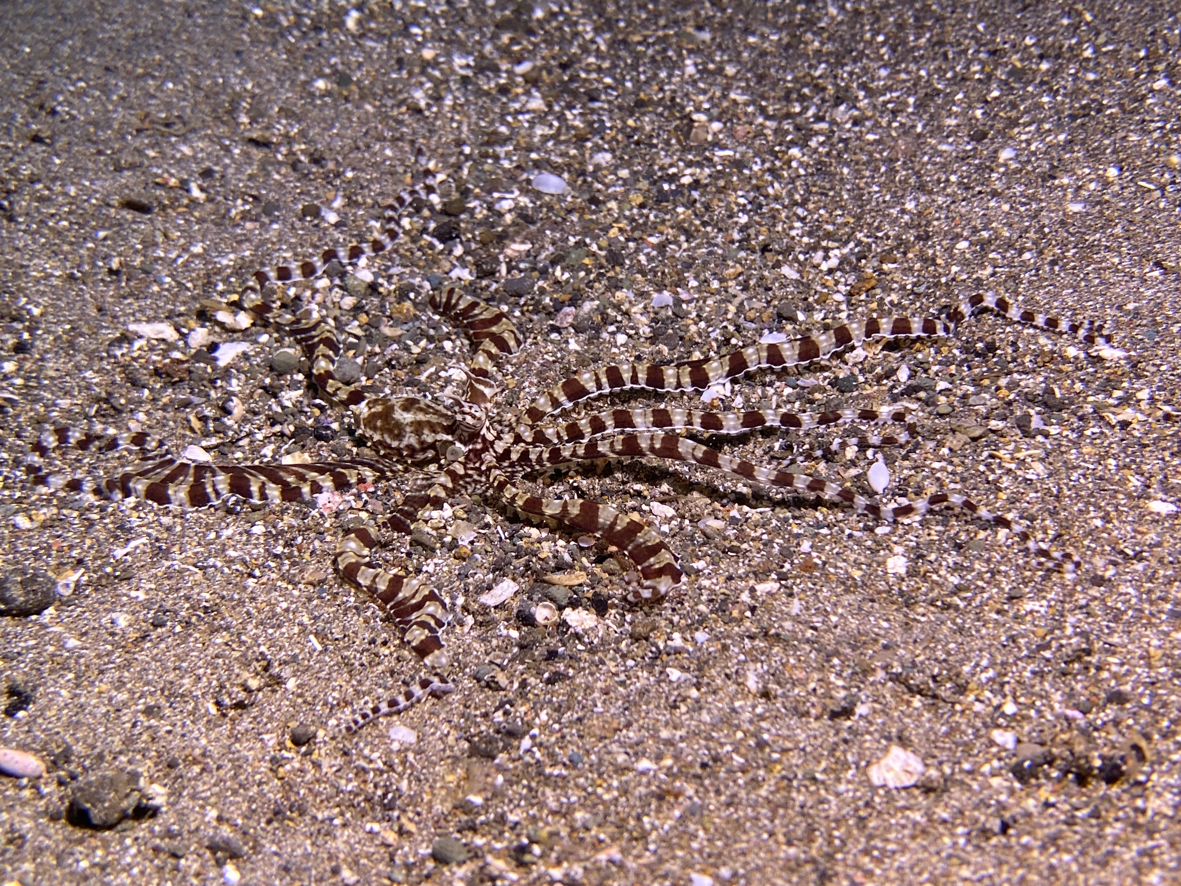 Maar na de derde duik, inclusief een nachtduik kijken we me plezier terug. Er is een octopus gevonden. Het was een aardig diertje wat graag de interactie met de pointer Romnick aan ging. Het is een beestje met twintig centimeter lagen tentakeltjes, max, hij zit in een holletje, alleen zijn oogjes zijn aanvankelijk te zien. Maar hij steekt graag een tentakel uit om iets vast te pakken. Hij is zeer giftig en heeft in zijn nekje blauwe ringen, die blauwer worden als hij zij zich bedreigd voelt. Wat hij vandaag dus niet voelt. Al zou je het hele uur lang niets anders vinden, dan was je al gelukkig.