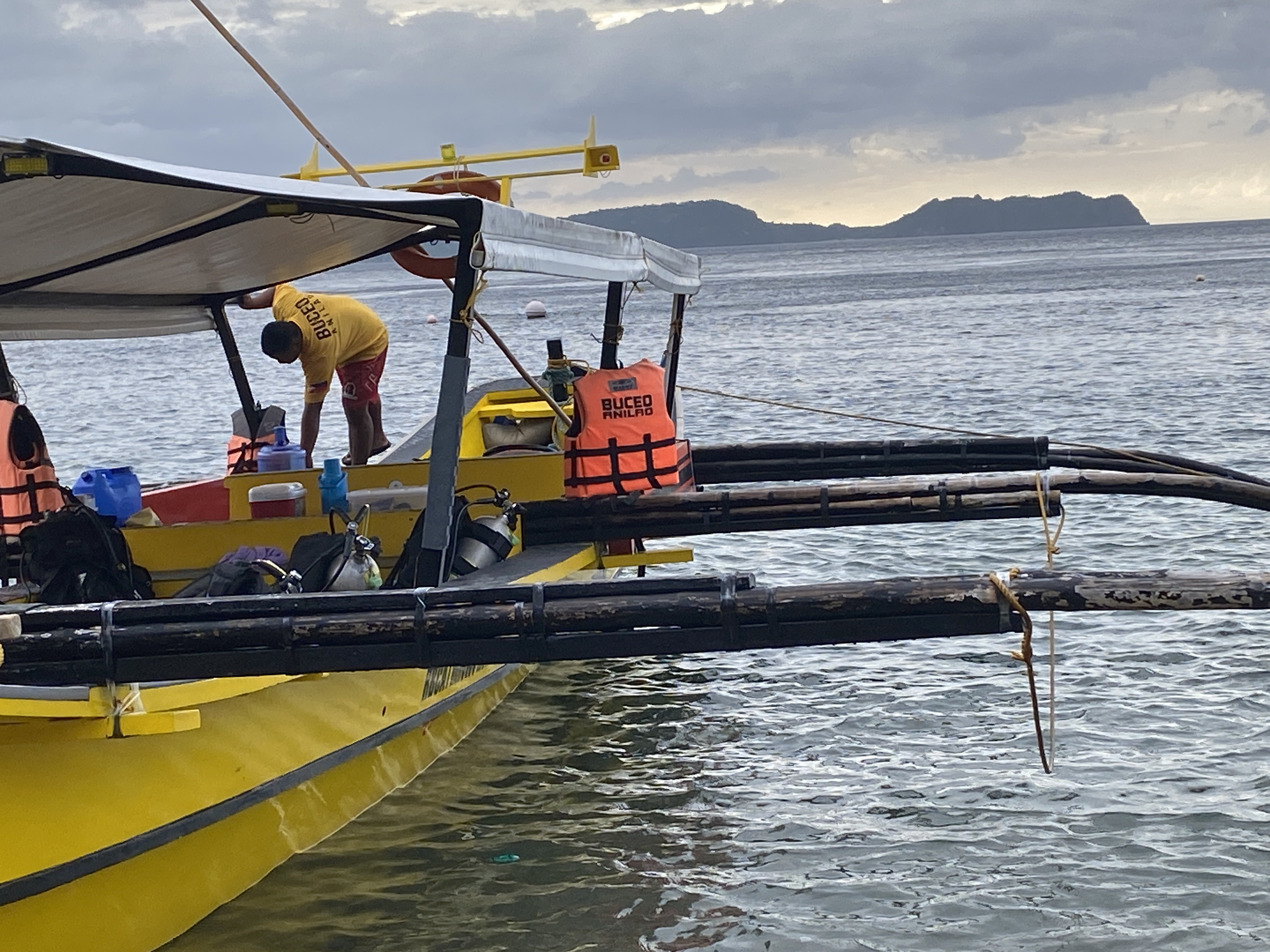 Hoeveel van die handdoeken er per dag door gaan: ik schat per gast zo’n twee soms drie per duik, drie duiken per dag. Het is nu rustig, de helft van het totaal aantal mogelijke gasten. Dat zijn ruim honderd handdoeken per dag, en bij volle bak het dubbel. Ze worden constant ingezameld, gewassen en keurig opgevouwen voor gebruik. Ze liggen vers op onze duikboten, samen met water en heet water voor thee of oploskoffie, en een verse doos oreokoekjes. Dat naast alle sets voor de duikers en twee flessen per duiker, het wordt allemaal op de schouders over het keienstrand aan boord gesjouwd, oer de smalle looplanken. Dus echt een plank breed. We duiken in traditionele prauwen met dubbele riggers. Wel gelukkig voorzien van een dieselmotor onder het dek. Je ziet ook overal eenpersoons versies liggen en varen, vaak in vrolijke kleuren. Daaruit wordt gevist met een lijntje.