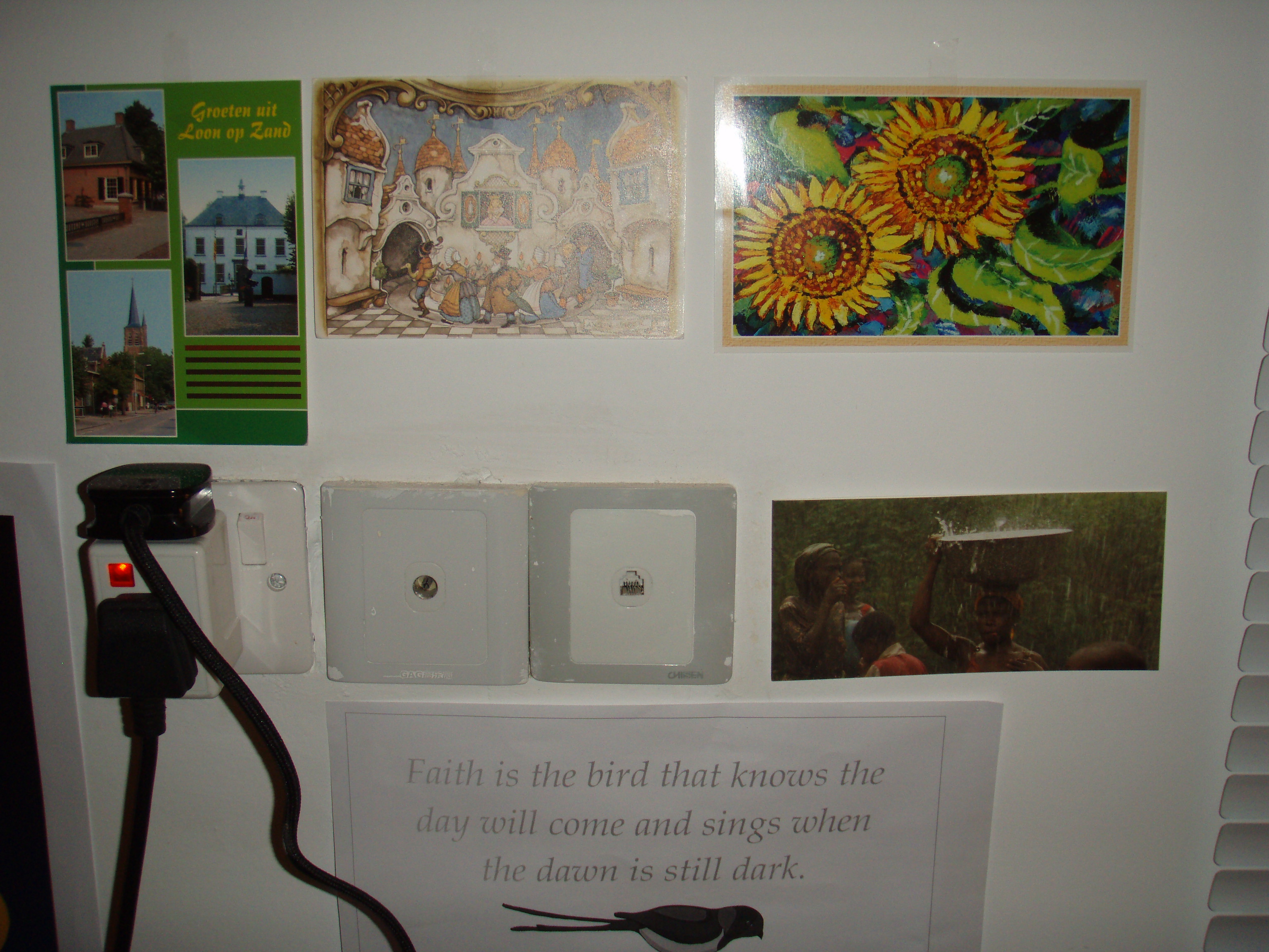 P7210016 Net als je denkt dat de post nooit zal komen, komt er van alles tegelijk. Vanmiddag werd een pakketje afgeleverd dat in Bagdad was aangekomen. Ikzelf zat toen al in Basrah, onwetend van het feit dat ik hier een ander adres heb. Na een week of drie kwam er een konvooi langs, of die jongens hebben het elkaar via een andere compound doorgeven, maar in ieder geval: mijn pakketje, besteld bij Amazon, was gearriveerd. Ik blij, een goed teken dat ook mijn I pod touch mij zal bereiken binnenkort. Toen ik probeerde in de warwinkel van papieren orde te scheppen vanavond bleek dat er ook drie kaarten bij zaten! Ik nog veel blijer, want ik dacht al dat dat niet zou lukken. Weliswaar weet ik dat niet alles is aangekomen, en ook een zending via DHL is al weken onderweg maar toch. Nu hangen er twee kaarten uit Kaatsheuvel aan de muur en een uit Groningen. Bedankt Jacky en Joke! Eens zien hoe vol die muur komt, het is makkelijk plakken hier op de witte muren. Het juiste adres hier nog even voor de volhoudertjes of degenen die de smaak te pakken hebben gekregen: Linda Rose Smit, RTI/#004, APO AE 09374 ,(Basrah, Iraq) Nu maar weer afwachten wanneer de volgende zending komt. Leuk!