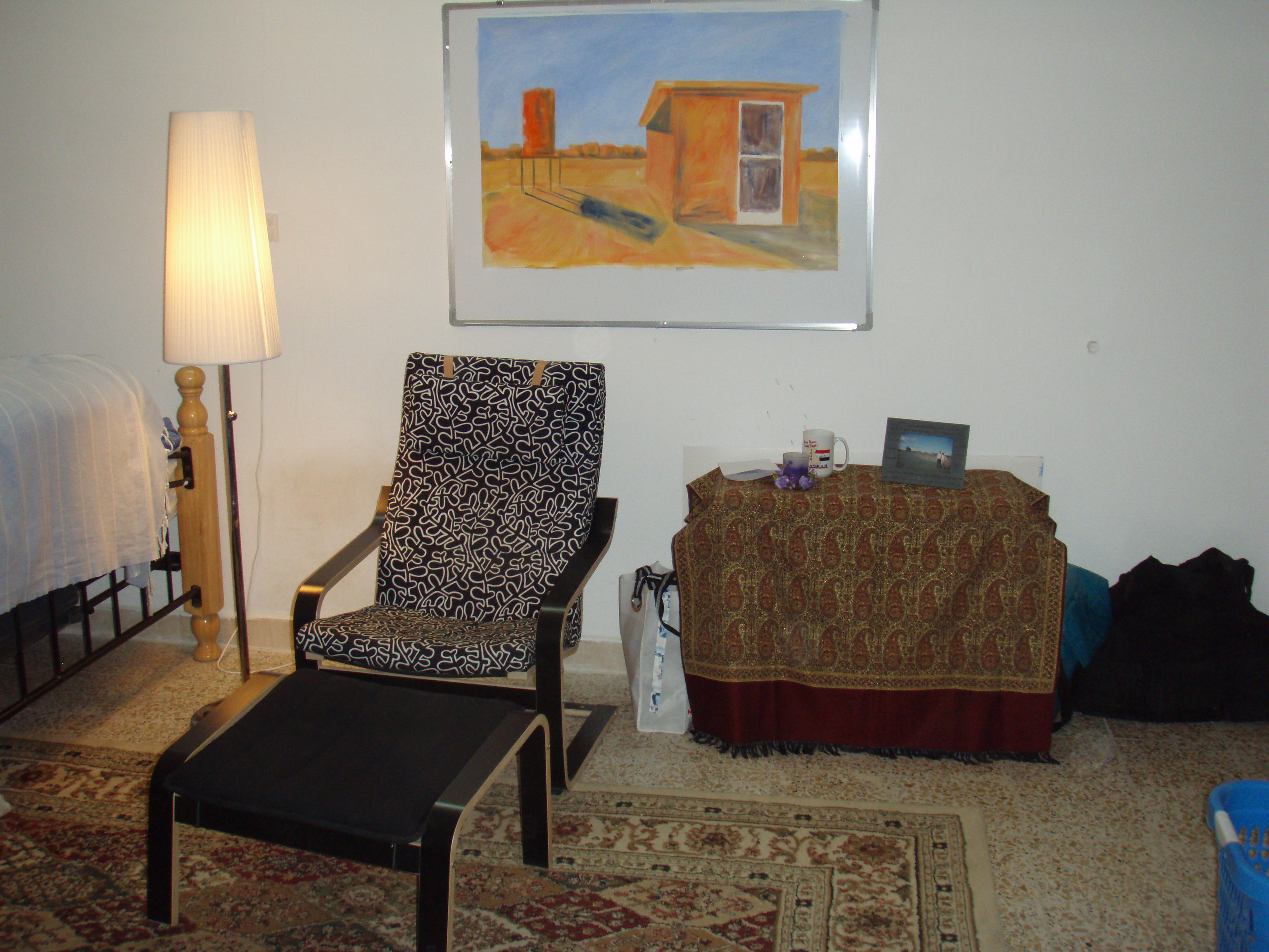 Verhuizing Ik ben verhuisd, oplettend lezertje. Weliswaar nog steeds in Basrah, weliswaar nog steeds dezelfde compound, maar een nieuwe kamer in een ander gebouw. In de hoop dat deze kamer ’s morgens iets rustiger is. Dat weet ik natuurlijk pas morgenochtend, als iedereen wakker is, of na vertrek van het volgende konvooi. Heb al een deur gezien die roet in het eten kan gooien, maar weet ook al wat daar aan te doen is morgen. Als voordeel van deze verhuizing heb ik nu een veel grotere kamer, dus meer lege ruimte. Ik heb een ruimere ladekast. Ik heb een soort tussenkamertje naast de badkamer en in die Badkamer een echt ligbad… Ik heb een raam aan de schaduwkant waar daglicht doorvalt (die andere was afgeplakt vanwege de warmte). Het nadeel:  geen lcd televisie (dat was de grote magneet voor degene met wie ik de kamer ruilde). Het schattige kaptafeltje is ook omgeruild voor een meer oorspronkelijk Iraaks exemplaar dat nu in dat tussenkamertje naar de badkamer staat. Zeeën van ruimte, mijn schilderspullen op een tafeltje onder de whiteboard. Nieuwe buren en een die wist hoe de afstandbediening van de airco werkt. Daar zit namelijk nog een klepje op  dat ik niet eerder zag. Ongekende horizonten dus weer.  Een collega die boodschappen deed in de PX bij het vliegveld bracht een emmer en schoonmaakspullen mee, dat was tot nu toe behelpen. Er zijn weliswaar aardige dames die de was doen en de vloer vegen, maar een keertje echt zelf schoonmaken voor je je nieuwe huis betrekt, dat heeft er altijd in gezeten en dat zal wel niet meer weggaan. Kortom: weer allerlei spannends hier in Basra. Never a dull moment.