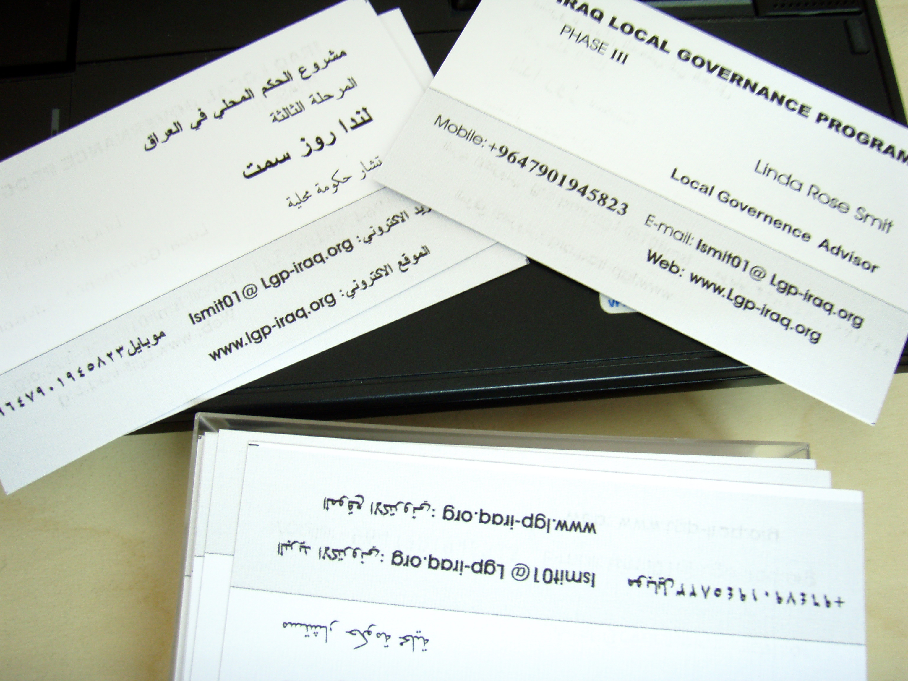 P7210015 Een paar weken geleden werd me gevraagd wat er op mijn visitekaartjes moest komen te staan. Keurig doorgegeven, maar de eerste keer dat ik er een nodig had twee weken geleden waren ze nog niet gearriveerd. Nagevraagd en gezegd dat ik ze graag voor woensdag zou willen hebben. Men zou zijn best doen. Dat werkte uitstekend, vandaag kwamen ze aan, een uur nadat het bezoek was vertrokken. Toch blij, hoe vaak immers krijg je een visitekaartje met aan een kant de Engelse tekst en aan de andere kant hetzelfde (hoop je) in het Arabisch? De collega’s op kantoor er een gegeven en nog eens gekeken wat er precies stond.  Van alles natuurlijk, inclusief een flinke fout. Dat krijg je ervan als de drukker geen Engels spreekt en de besteller haast heeft. Dus nu nog maar eens wachten wanneer de volgende zending foutloze kaartjes komt. Mijn eerstvolgende afspraak met iemand van buiten is zondag. Zou dat lukken denkt u, oplettend lezertje?