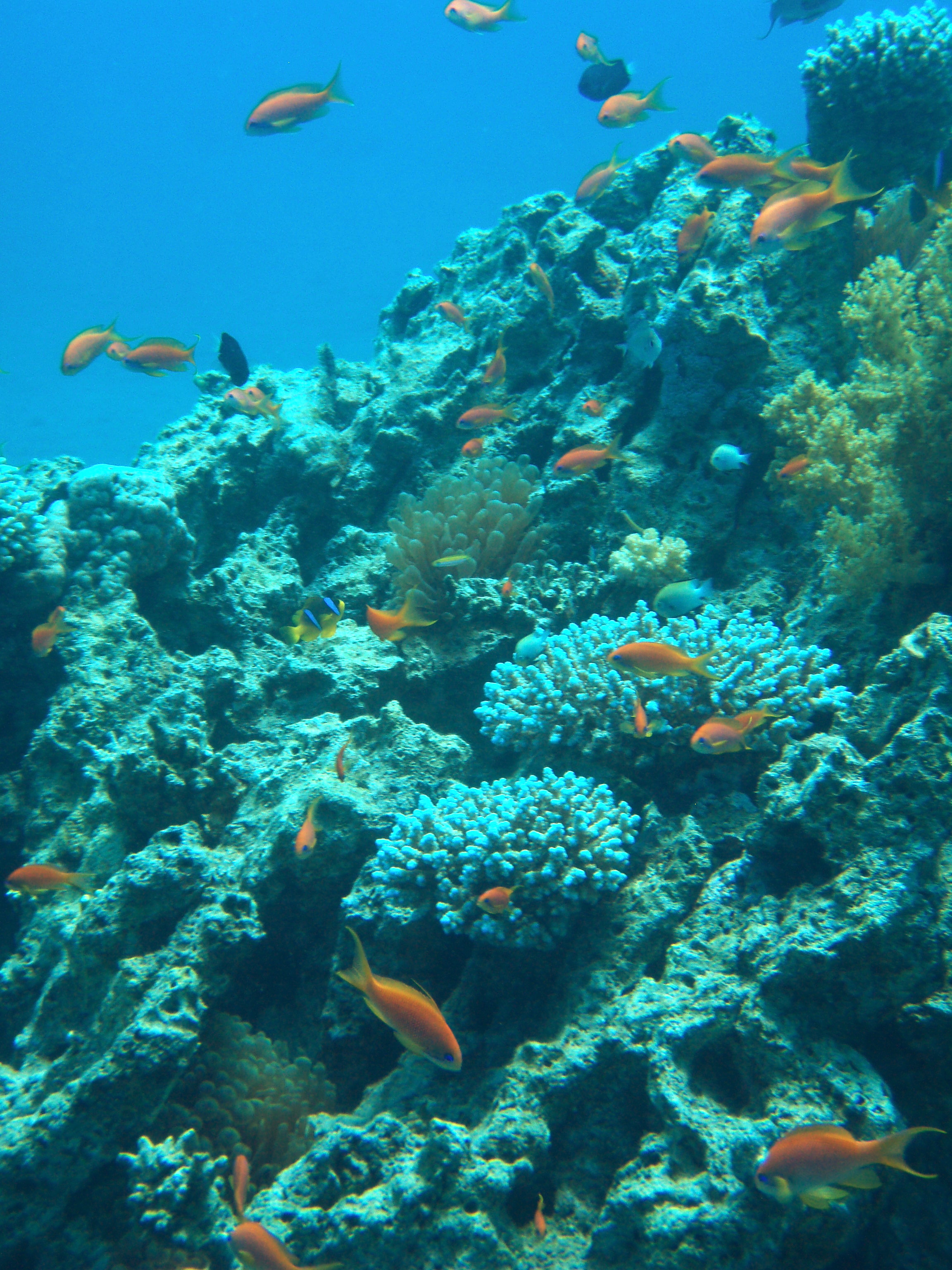 Mag ik u een goede raadgeven, oplettend lezertje? Ga duiken! Het is prachtig daar onder water, eenheel nieuwe wereld. Dichter bij vliegen kun je niet komen dan wanneer je op eenmetertje of twintig onderwater zweeft. Mag ik u nog een raad geven? Begin nietaan onderwater fotografie. Dat is lastig! Je moet heel stil hangen, je camerastaat nooit snel genoeg op de goede voorkeursinstelling. Vissen maken altijdnet een bocht als jij ze er recht op wilt. Maar vooral: het water vreet dekleuren uit je foto’s. Wat je zelf onder water ervaart als vlammend rood englanzend oranje, is op een foto meestal maar vaal van kleur. Dat rood moet danweer terug in de foto’s, de meeste progamma’s kunnen dat, met een beetje geluk.Dan moet het onderwerp niet te ver af zijn, je moet vooral wel flitsen maarsoms lukt het dan weer die flitsende kleuren terug te toveren. Groot nadeel vande hedendaagse digicamera’s: zolang je batterij het doet blijf je schieten. Dusnu heb ik zo’n vijfhonderd vijftig onderwater foto’s die allemaal bewerktmoeten worden. Eerst maar eens alles wat echt mislukt is er uit halen, alleswat gedraaid moest worden gedraaid, en nu ben ik ze allemaal aan het bewerken.Geen idee hoelang het duurt voor alles bewerkt is, maar hier heeft u er alvasteentje. Voor een reisverslag is binnenkort een ander weblog beschikbaar. Daarleest u over als het zo ver is.