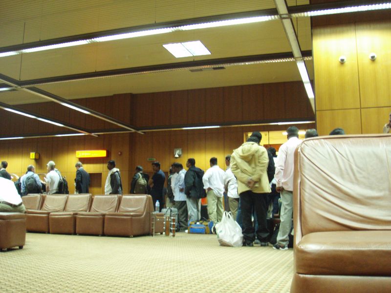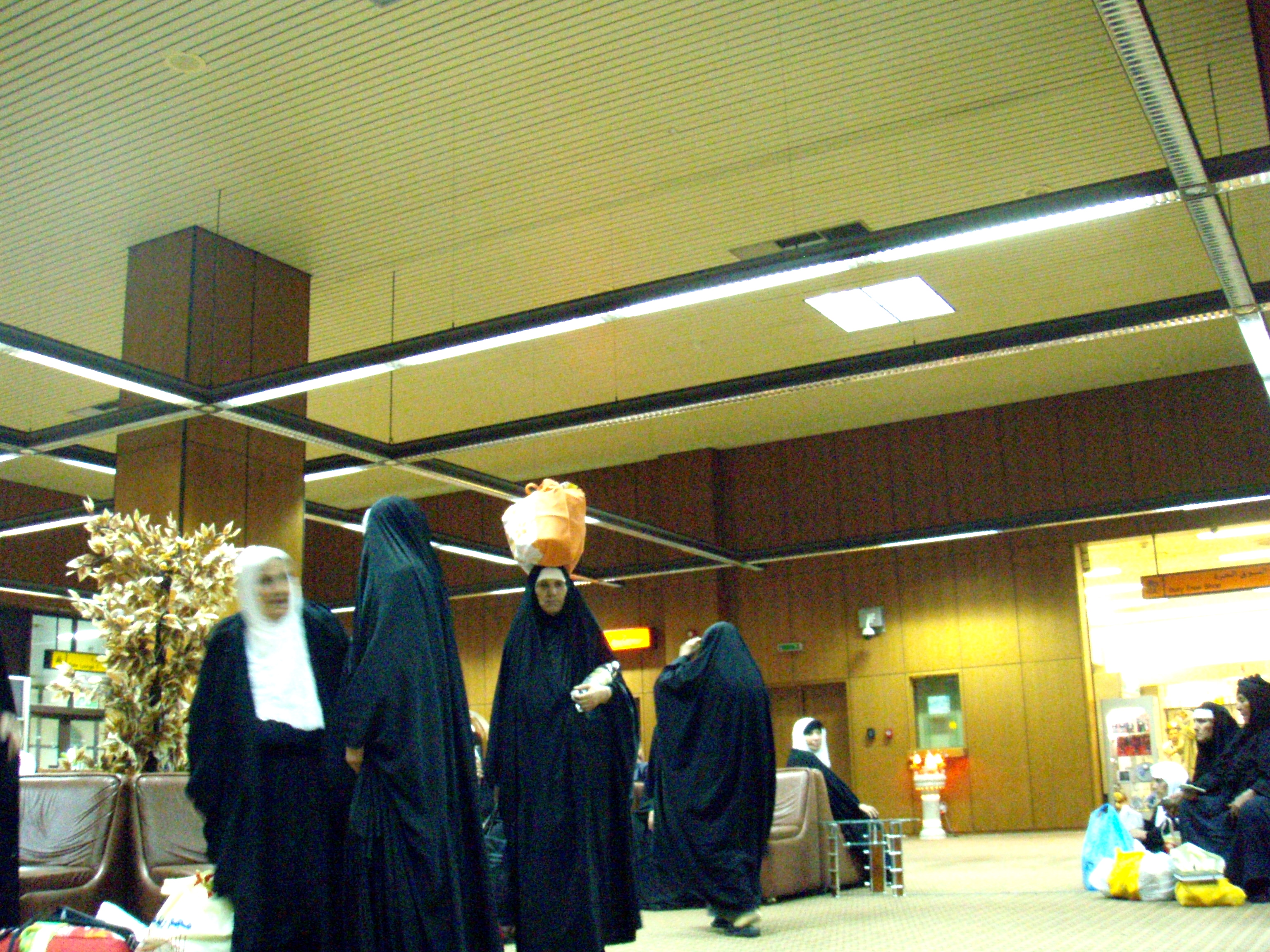 De man achter de balie wil nog een keer mijn paspoort zien. In een groot schrift schrijft hij nauwkeurig allerlei gegevens over. Op mijn ticket staat als passagiers naam Ms Linda. Dat moet genoeg zijn. Ik kan dxe0xe0r gaan zitten. Nee, zegt een tweede hulpvaardige man, je moet daardoor. Nee, ik moet toch gaan zitten. Kennelijk is er net een toestel aangekomen, tientallen mannen in traditionele kledij, Jallabya en khuffia, stromen de lounge binnen. Op de speakers gezangen uit de Koran, afgewisseld met iemand die met omfloerste stem iets voordraagt. Een van de mannen steekt zijn hand tegen mij op in het voorbijlopen, hij kijkt wat verbaasd. Nu de mannen er allemaal zijn, komen ook de vrouwen in groepen naar binnen, druk pratend. Ze spreken elkaar aan met Hadj en Hadji, ze komen kennelijk terug van de grote Hadj. Hun handbagage in plastic tasjes met zich meedragend. sommigen met de flightbag op het hoofd. De airport lounge van Basrah is drukker geworden, maar schattig in zijn omvang. Alles is er, maar een karretje om je bagage op te zetten is eigenlijk niet nodig. Vlak na de ingang de eerste bagagecontrole, twintig meter verder de ingang van de vertrekhal. Alles is gecontroleerd, maar mijn flesje water vond niemand een probleem. Alles waar een snoertje aan zit wordt nauwkeurig bekeken, soms moeten batterijen verwijderd en weggegooid worden. Tegenover mij in de lounge de Duty Free Shop, achter mij een winkel waar je de laatste souvenirs van Irak kunt aanschaffen. Terwijl ik dit schrijf zet een man zijn plastic tas naast mij neer, of ik er even op wil passen, hij komt zo terug. Vermoed ik dat hij zegt, hij spreekt Arabisch. Dat moet je dus nooit doen leer je steeds, maar na zoveel controle zal deze partij plastic tasjes wel verantwoord zijn. Bovendien, als je zo dicht bij zit als het fout gaat, hoef je je ook geen zorgen meer te maken. Een hele troep Indiërs vertrekt ook vandaag, vermoedelijk met hetzelfde vliegtuig als waar ik in zit straks. Richting Dubai. Hier en daar een verveelde Westerling, ook op weg naar huis. Als bij toverslag verlaten alle traditioneel geklede Arabieren weer de lounge, en even zo plotseling komen ze weer allemaal terug. Een van hen gaat in gebed vlak voor gate 2. Bidden kun je overal en altijd, zelfs zonder kleedje. En achter mij twee vrouwen, dat is helemaal zeldzaam, die doen dat anders nooit in het openbaar. Kennelijk is dit een te belangrijke gelegenheid om je van dat soort conventies iets aan te trekken. Of ze zijn van een losse stroming, wie zal het zeggen. Een vouw draagt een groene container met water, ongetwijfeld heilig water, het zit in een verkooptasje met een moskee erop. Nog meer bagage op hoofden wordt binnengedragen. Ze dragen boeken bij zich, niet de Koran, maar wat dan wel. Hoe langer ik hier zit, hoe nieuwsgieriger ik word.Een gesprek beginnen zit er niet, mijn drie woorden Arabisch is hier niet genoeg. Ze zitten erbij of ze thuis zijn, in volle waardigheid.