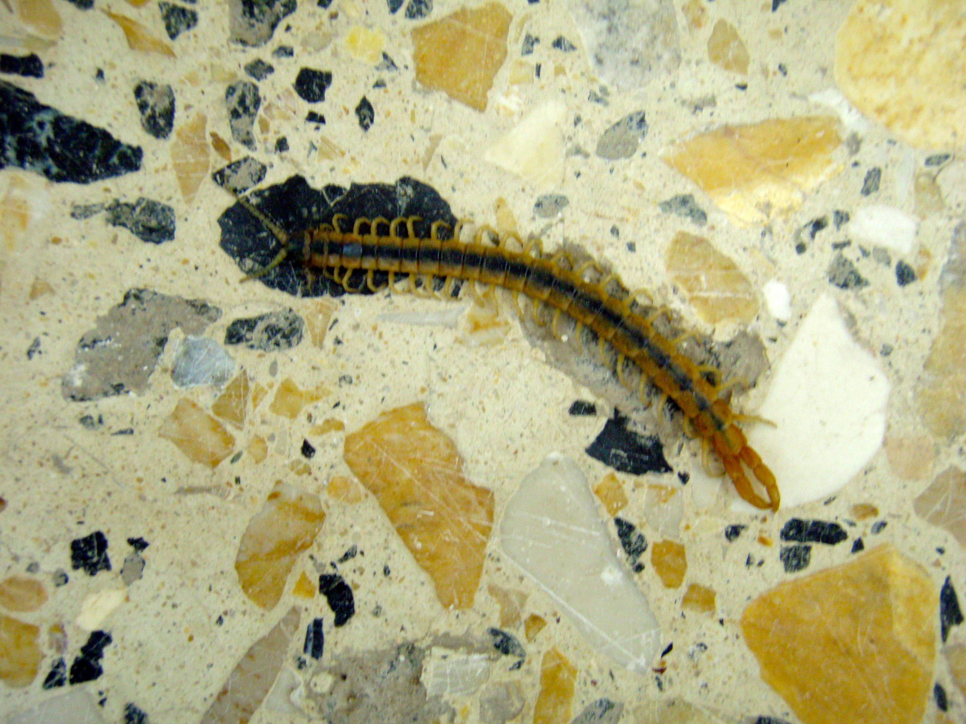 Tijdens de bijeenkomst over de rapporten werd M gebeld en ging tegen de muur aan staan bellen. Ineens ging hij tijdens het gesprek door de knieën. Hij is religieus, maar daar kon dit niet mee te maken hebben. Het was dan ook een duizendpoot die hij daar gevonden had. Het beestje trok in een uiterst traag tempo van daar waar het vandaan kwam richting de uitgang. In het tempo dat hij had vermoedden wij dat het wel een dag kon duren. Gelijk een foto gemaakt en geteld hoeveel poten hij had. Veertig, zei ik tegen de aanwezigen. Nee, 44 moesten het er zijn, want zo heet hij: 44. Niks honderd, niks duizend of miljoen, geen reden tot overdrijven. Gewoon 44 poten. En dan nog zo langzaam!