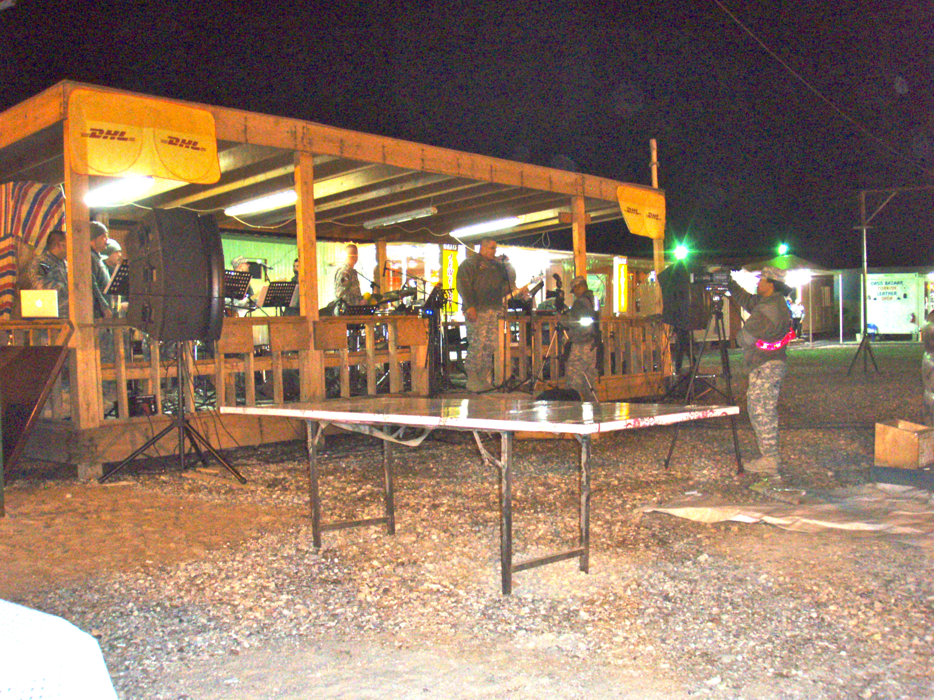 P1130002 Ik heb hier een aantal keer geschreven over de base of de COB, oplettend lezertje. Deze dagen heb ik wat meer tijd, en ook een grote auto tot mijn beschikking om rond te rijden. Automaat uiteraard, zeer interessant. Er is hier van alles, maar je moet wel weten waar. De base is een uitgelezen plek voor blast walls en zandzakken, dus alles lijkt wel wat op elkaar. Allerlei sub basesjes, die onder verschillende veiligheidsregimes vallen met eigen hekken of bewakers aan de poort. Donderdagavond is hier de avond dat voor velen het weekend begint. In The Oasis is live muziek. Een ensemble van de zoveelste airborne divison band speelt er lustig op los. Latin en rock. Echt muziek om op te dansen en het vloertje ligt er, maar men kijkt, en staat, en danst niet. We eten bij de turk, buiten, in de kou, het is hier nu fris ’s nachts, maar binnen brandt de tl verlichting op volle kracht. Een aardig ongestructureerde maaltijd, met steeds meer mensen die aanschuiven en gerechtjes die door iedereen gegeten worden. De militairen mogen alleen in uniform verschijnen, die dragen geen burger. Die staan dus volledig gewapend, geweer om de schouder of pistool op de heup, gezellig met elkaar een sigaartje te roken. Drank is er niet op dit soort plekken. De combi drank en wapens is dan ook geen gelukkige.
