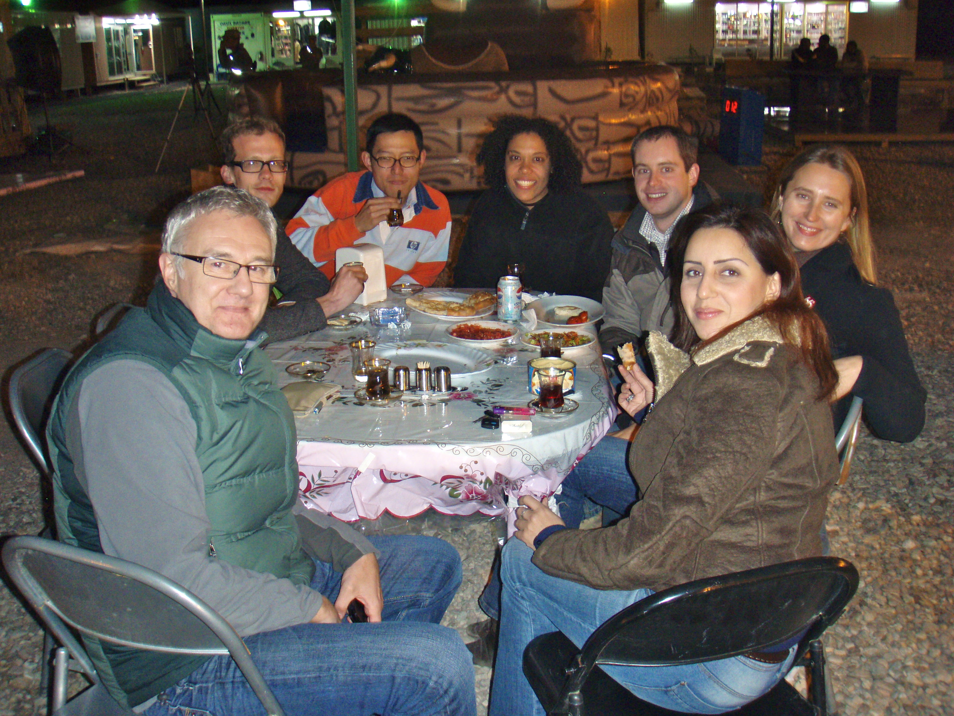 Stelt u zich een kaal veld voor, met zand en grind. daar omheen trailers, die gebruikt worden als winketjes. In de bediening: Iraki, Indiërs, Pakistani, Turken. Net als in de winkeltjes. In die winkeltjes van alles waarvan je nooit dacht dat je het zou willen hebben. Toch wordt het verkocht, alles glimt en blinkt en is in China gemaakt. Ik ga hier op zoek naar een elektrische vliegenmepper. Iemand heeft bedacht dat er een fontein moest komen, dus nu is er een kuil, daaromheen stenen en een straal water die vrolijk omhoog spuit. Een struikje hier en daar doet dappere pogingen groen te blijven. De toiletten zijn van die plastic hokjes die je bij evenementen ziet. Betegelde routes langs de winkeltjes. Klapstoetjes en plastic tafeltjes op het terras van de druk bezochte Turk. Waterpijpen bij het loket en rijen om af te rekenen. Men kan gratis eten in de Defac, daar is het eten uitstekend, maar voor de  afwisseling gaan mensen hier toch graag zitten af en toe. In het midden, naast de ongebruikte dansvloer: een stier met een opblaasmuur om zich heen. Daar kun je dan rodeo rijden, maar niemand die zich daar aan waagt. Bij mij aan tafel Amerikanen, Britten, Franxe7aises, Latinos. Na het eten naar de avond in de Donkey bar. Een genodigden lijst met namen, vrouwen mogen er altijd in. De drank is duur, de muziek is hard, buiten is het fris. Tot diep in de nacht praat en drinkt men. Ik ontmoet en aantal mensen die met nuttige dingen bezig zijn hier en haarscherp in de gaten hebben waar het in het Midden-Oosten om draait en hoe succesvol de Westerse interventie is. Afspraken voor verdere gesprekken worden gemaakt. Terug in de trailer is het behoorlijk koud en halverwege de nacht accepteer ik dat het dekbed daarvoor niet is bedoeld. De verwarming gaat aan. Dan kun je niet slapen van de herrie, maar ben je in iedere geval warm als je wakker ligt.