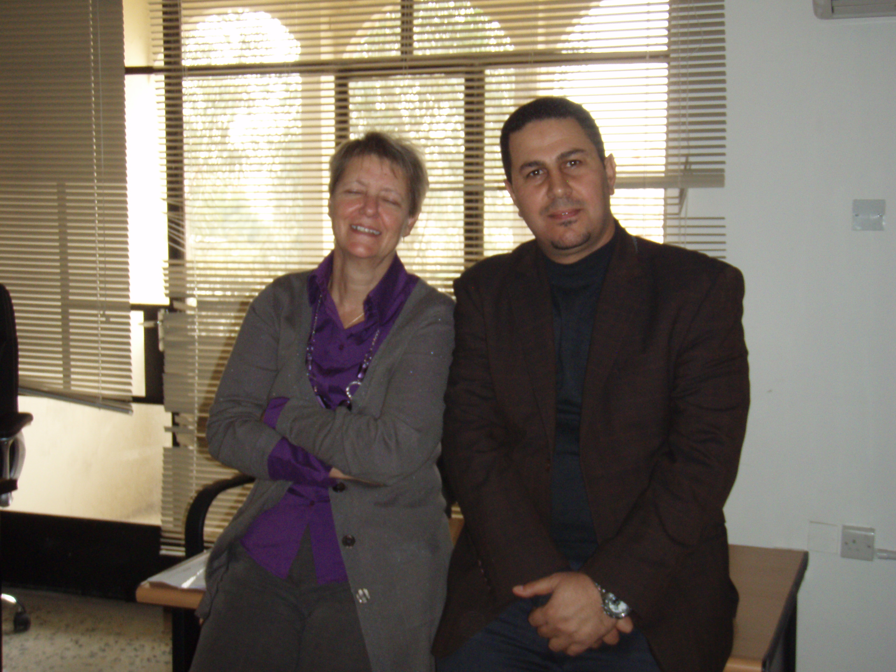 P1050015 Ik had het vaker over hem, M, de intelligente journalist die hier bij de Legal Eagles werkte. Hij schreef zelfs een boek (Wie wil het vertalen: De rol van het Icoon van Mohammed in de Westerse Cartoons, een antropologische benadering). Kort na de zomer vertrok hij naar Bagdad om zijn PhD in de Politieke Wetenschappen te gaan halen. Wat hij bestudeert? De politieke pluriformiteit. Het gaat hem zeer ter harte. Hij is de meest seculiere medewerker die we hier hebben, en durft zelfs te vertellen dat hij Allah en zijn almacht in twijfel trekt. Ongekend, zeker in het openbaar. Vandaag kwam hij weer even langs, om zijn oude collega’s te groeten. Overal dikke omarmingen, met zijn mannelijke collega’s. Vrouwen krijgen een hand. Zelf moet hij daar ook vreselijk om lachen. De manier waarop mannen elkaar hier begroeten is uiterst hartelijk, met vooral veel zoenen als je elkaar een tijd niet hebt gezien (een dag of drie is genoeg). We are homosexuals, zegt M, met een grote grijns. Hij weet wat er op de wereld te koop is. In het verlengde van de verbazing van D in Engeland, merkten we op dat het precies omgekeerd is. Hier mag je vrouwen niet zoenen, bij ons zou men toch even opkijken van de manier waarop mannen gearmd over straat lopen of elkaars hand vasthouden tijdens het gesprek. M zit er niet mee, hij staat overal voor open. Maar juist hij zit in Bagdad, in plaats van in het buitenland. Zijn Engels schiet ernstig te kort. Jammer, hij zou ons veel te vertellen hebben.