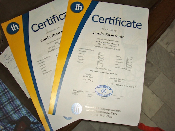Niet dat ik nu niets meer bij kan leren, maar de cursus is achter de rug hier. Twee certificaten rijker zijn we allemaal, keurig nog met gradaties van A+ tot D- (wat niemand had trouwens, een D). Omdat steeds meer cursisten verdwenen of al weg waren ivm Eid tripjes naar de omliggende landen, het laatste deel van de middag doorgebracht met onze lerares en drie medecursisten om te praten over de stand van zaken, de rol van de Islam, de ontwikkeling van de taal. Zeer de moeite waard ook, het geeft een inkijkje van binnen uit. Nu zit mijn juf op het balkon hier privé les te geven aan een jonge Amerikaan, die hier over de straten skateboardt. Hij met zijn honkpal petje, zij met haar hoofddoekje om. De wereld ontmoet hier elkaar. Zo voor de laatste keer in het spitsuur met de metro voorlopig, en daarna pakken voor de woestijn. Ik zie er erg naar uit, de witte woestijn moet prachtig zijn. Daar ziet u dan straks ook wat van, oplettend lezertje, als ik over een week weer onder de online mensen ben. Tot die tijd wens ik u veel plezier waar u ook bent. Voor de moslims onder u Happy Eid en tot volgende week.
