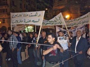 Ik wist van de mars en ging op zoek, maar waar ik dacht dat ze inmiddels zouden zijn vond ik niets. Dan even een boekwinkel in, bij buitenkomst liep net de kop van de stoet het pleintje op waar ik was. Het was een uiterst goed georganiseerde, indrukwekkende mars. Er werd niet gesproken, er liepen veel jongeren mee, er was muziek en tromgeroffel. Honderden langs de kant beantwoorden het V-teken van de demonstranten, er werd gefilmd en gefotografeerd. Het volkslied werd gezongen bij aankomst op Tahrir, waarna de speeches begonnen. In de optocht de foto’s van de slachtoffers van de vorige demo, kruizen, een grote doodskisten en stilte. Langs de kant mensen die groetten voor het volkslied, mensen met plakkaten die aangaven dat Islam en Christendom samen Egypte vormen, mensen met tranen in de ogen en veel ernstige gezichten. Het laatste deel heb ik naast de stoet lopen filmen, als het meezit krijg ik die Maspero mars, eigen film op Youtube opgeladen hier, het was de moeite waard.