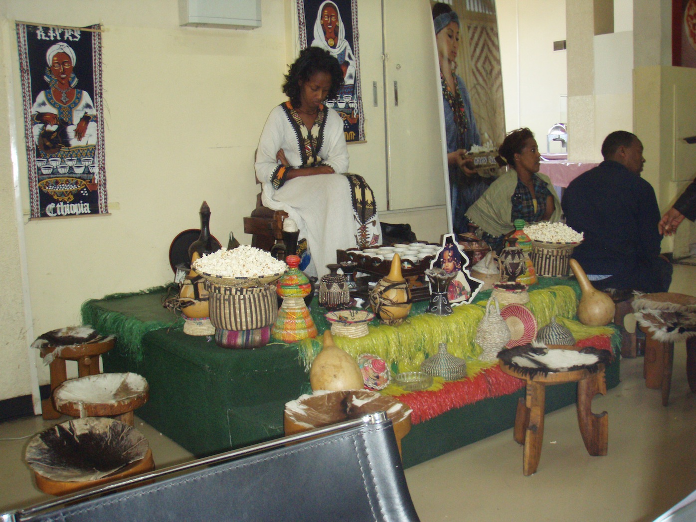 Ik weet niet hoe het u vergaat, oplettend lezertje, maar ik slaap op reis niet of nauwelijks. Klaarwakker en moe kijk ik alle vreselijke comedies of probeer op een te klein scherm een film te genieten. Deze vlucht zat er een jonge geestelijke naast mij. Aan zijn uiterlijk te zien zou ik denken, een Kopt, al weet ik niet of ze die hebben in Ethiopië, want daarheen keerde hij terug. Zijn collega’s, ouder en met een duurder hoofddeksel, reisden eerste klas, geheel indachtig de woorden van hun spiritueel voorbeeld. De jongeman naast mij deed zijn hoge hoedje af toen we opgestegen waren en ruilde het in voor een slap maar mooi geborduurd mutsje. Daarna sliep hij de slaap der rechtvaardigen. Nu kan ik hier vier uur genieten van het vliegveld. Naast mij zit een juffrouw in nationale kledij op een platform met allerlei attributen om haar heen, waaronder theekopjes. Ik vermoed dat ze daarin geen thee schenkt.