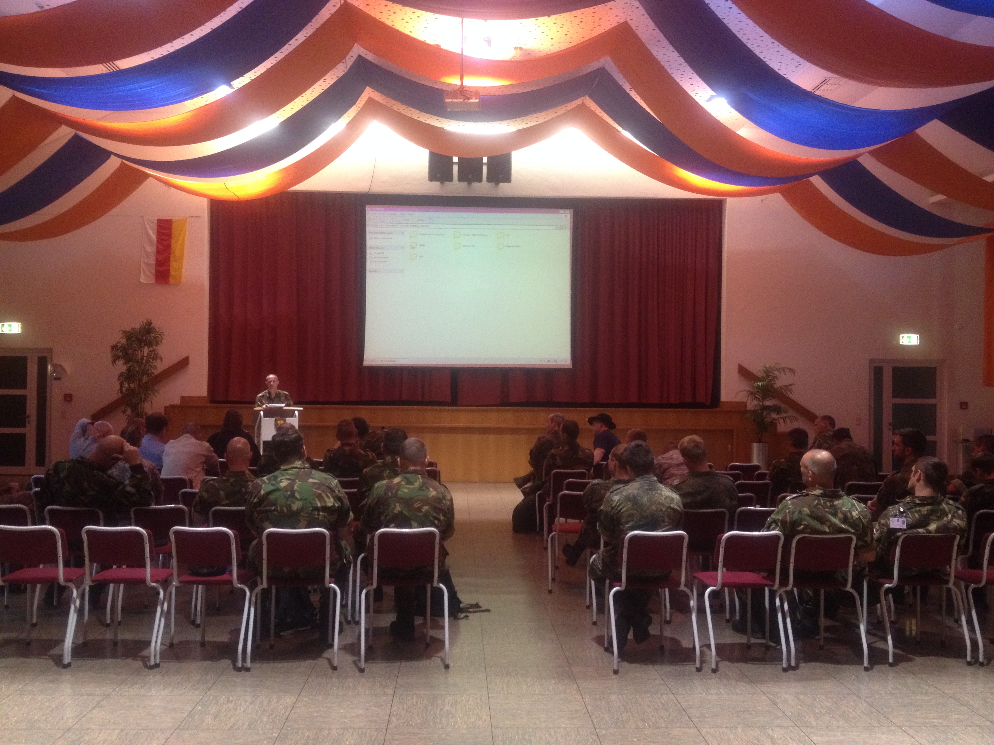 Bekenden voelen al bijna als familie, het battle rythm wordt snel eigen gemaakt. Vandaag het inspreken, inchecken, inloggen en inlezen. Morgen bedenken wat voor verhaallijnen nuttig en uitvoerbaar zijn en echt aan het schrijven. Want waar ik in vorige oefeningen roleplayer was die soms iets aan het script aanvulde, ben ik nu scripter die ook af en toe role-playet, maar ook de uitvoering tijdens de echte oefening straks bewaakt en aanpast. Een nieuwe uitdaging dus. In een prachtige werkomgeving. Schitterend weer waar wij alleen tijdens de wandeling van kantoor naar aula, of tijdens de pauzes van kunnen profiteren.