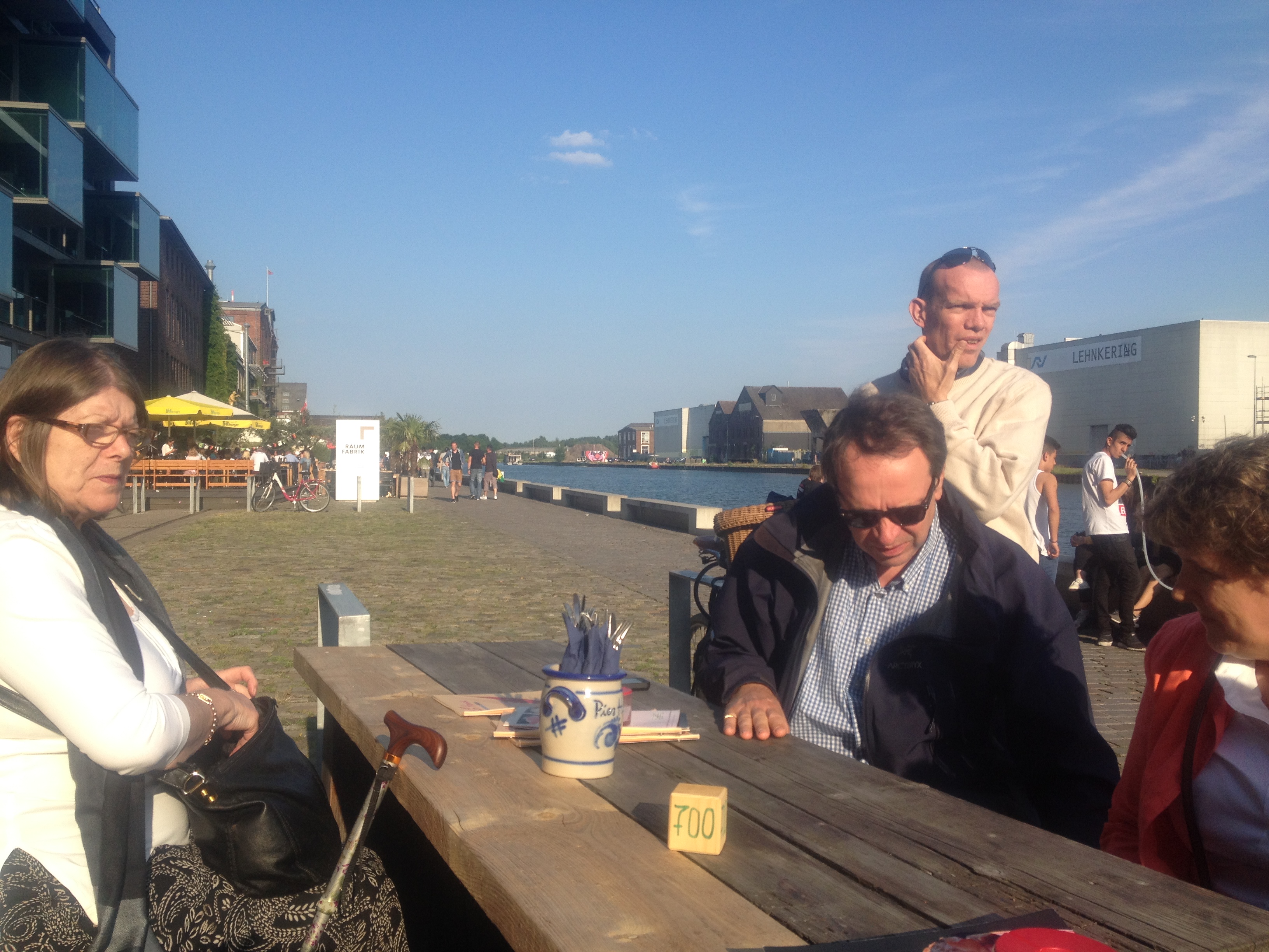 Haast traditioneel eet zo’n groep een keer samen, en we troffen het met deze dag. Aan lange tafels zaten we aan het water van de industriehaven, waar nu allerlei horeca en kantoren zich vestigen. Duitsland-VS op een groot scherm onder de luifel. Daar hoef je niet naar te kijken, je hoort vanzelf hoe het gaat. Na afloop van de wedstrijd druk op de kade. Oranjekoorts kennen ze hier ook. Ondertussen aten wij verder en genoten van het eten en van elkaars sterke verhalen. Geen doorsnee gezelschap, maar mensen van alle hoeken en gaten, met ervaringen van over de hele wereld. In opperbeste stemming bleven we buiten tot het te koud werd. Inmiddels wordt er al informatie verstrekt over de plek waar we in September het echte oefenonderdeel bij zullen wonen. Redelijk lastig bereikbaar dus het lijkt er op dat er samen gereisd gaat worden. We horen het vanzelf. Morgen de laatste lijstjes maken om mee verder te kunnen in Augustus en zorgen dat alles is opgeslagen waar het hoort, ingevuld waar men om vraagt. Dan de lange weg terug naar huis, in afwachting van een week gevuld met kunst.
